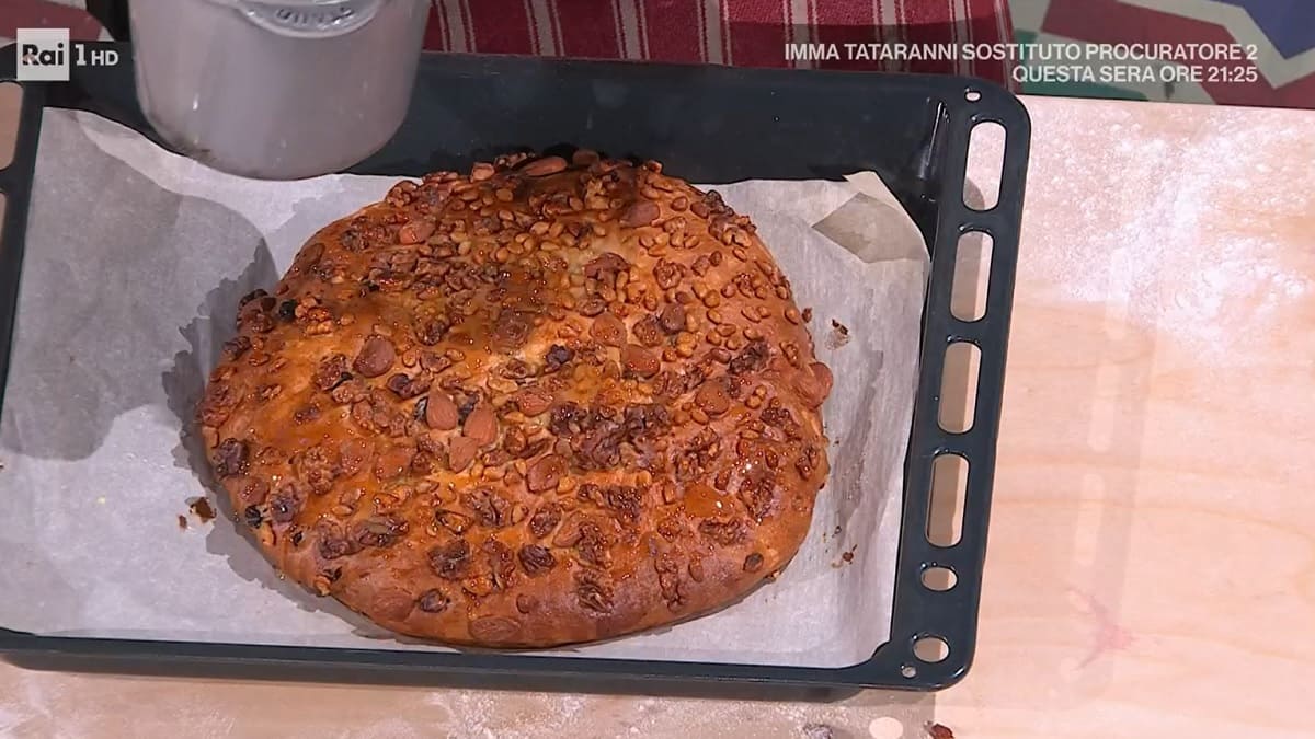 Per realizzare il dolce di Fulvio Marino a È sempre mezzogiorno, la piada dei morti, amalgamare insieme la farina, lo zucchero e il lievito. Aggiungere poi il vino, le uova e il latte. Versare nel composto il sale e l’olio. Incorporare infine il burro morbido. Unire poi all’impasto della piada dei morti i pinoli e l’uvetta. Lasciare lievitare il composto, a temperatura ambiente, fino al raddoppio del volume, dopodiché schiacciare con le mani il dolce di È sempre mezzogiorno e stenderlo con un mattarello. Adagiare la piada dei morti su una teglia con carta forno, spennellare con un tuorlo e aggiungere i pinoli, le mandorle e le noci. Lasciare lievitare fino al raddoppio del volume e cuocere in forno a 190 gradi per 20 minuti. Glassare poi la piada dei morti con il miele caldo.