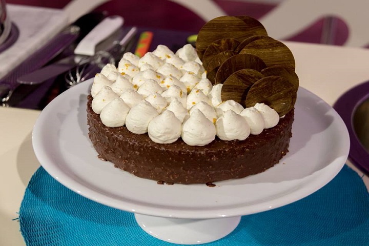 Mercoledì 23 è stata la volta del giovane pasticere Matteo Manzotti che a Detto Fatto ha proposto la ricetta del morbidissimo all’arancia (foto dopo il paragrafo). Per la realizzazione bisogna mescolare con la foglia 220 grammi di burro pomata, 180 grammi di zucchero di canna e 120 grammi d’arancia candita tritata in modo fine. Aggiungere un po’ alla volta 4 uova. Unire anche 50 grammi di panna fresca e gli aromi. Mescolare tutte le polveri a mano e aggiungerle un po’ per volta. Versare il composto in uno stampo e scaldare in forno cuocendo a 170 gradi per 25 minuti (dosi di polveri e aromi: 180 grammi di farina doppio 0, 80 grammi di fecola di patate, 9 grammi di lievito in polvere, 2 grammi di sale fino e 1 bacca di vaniglia). Per fare la glassa all’amaretto sciogliere 500 grammi di cioccolato fondente (70%) a 45 gradi, al quale aggiungere 100 grammi di olio di semi e 200 grammi di amaretti sbriciolati. Per la crema chantilly all’arancia montare in planetaria 50 grammi di mascarpone, 200 grammi di panna fresca, 50 grammi di zucchero semolato, una scorza d’arancia grattugiata e 1 bacca di vaniglia. Coprire la torta usando la glassa all’amaretto e decorarla poi con la crema chantilly (usando una bocchetta liscia n° 12). Completare con buccia d’arancia grattugiata e cioccolato a piacere.