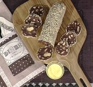 La ricetta sprint del salame al cioccolato ha aperto la puntata odierna de La prova del cuoco, regalando un’anteprima dolce al cooking-show di Antonella Clerici. Il gelato all’arancia con carota alla vaniglia di Pietro Di Noto ha chiuso poi la puntata prima della gara dei cuochi. Gli ingredienti per realizzare il salame al cioccolato sono: 250 grammi di biscotti secchi, 125 grammi di zucchero a velo, 125 grammi di burro, 50 grammi di cacao amaro, 100 grammi di cioccolato fondente, un bicchierino di rum, zucchero a velo e 100 grammi di mandorle tritate. Per la crema di accompagnamento del salame di cioccolato occorrono: 3 tuorli, due cucchiai di zucchero e mezzo bicchiere di marsala. Per realizzare il dolce, sciogliere il burro e versarlo sul cioccolato in pezzi, girando finchè gli ingredienti non si amalgamano bene. Aggiungere poi il rum, il cacao e lo zucchero setacciati. Unire infine i biscotti, dopo averli sbriciolati, e amalgamare bene il tutto. Arrotolare il composto, dando la forma del salame, e portare in frigorifero a rassodare. Infine decorare il dolce con la granella di mandorle e lo zucchero a velo. Per realizzare la crema allo zabaione, in una ciotola a bagnomaria montare i tuorli con lo zucchero e il marsala. Servire la salsa accanto al salame al cioccolato. In basso la foto del piatto della ricetta sprint di oggi.