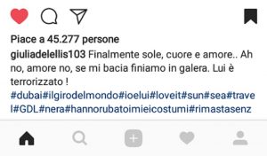 Come i fan della coppia ormai sanno, da ieri Andrea e Giulia sono volati a Dubai, per staccare un po’ la spina dalla vita lavorativa. Tuttavia, una dichiarazione fatta oggi da Giulia De Lellis ha fatto preoccupare non poco le followers della bella ex corteggiatrice di Uomini e Donne. Giulia ha infatti caricato su Instagram una bellissima foto in costume, e nella didascalia ha affermato che le hanno rubato tutti i suoi costumi che si era portata per andare in vacanza nella ricca città degli Emirati Arabi. Ma l’affermazione choc della De Lellis è stata un’altra: Giulia ha dichiarato infatti che finalmente ora si trova al mare, in cui c’è sole, cuore e amore. Si è poi bloccata, scrivendo che l’amore era meglio metterlo da parte almeno per questa esperienza, in quanto se l’avessero beccata a baciarsi con il suo fidanzato Andrea Damante, sarebbero finiti in galera.