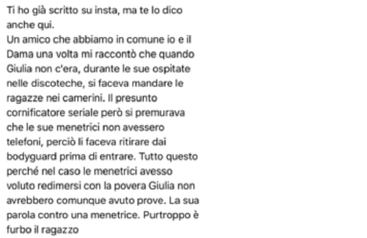 Ciò che però accredita la tesi sul tradimento di Andrea Damante ai danni di Giulia De Lellis sarebbe il fatto che le segnalazioni (che sono veramente tante) nonostante fossero scritte da persone diverse presentano lo stesso racconto. Insomma, tutte hanno descritto lo stesso modus operandi di Andrea per rimorchiare le ragazze. Damante dopo aver adocchiato una possibile ragazza, chiedeva ai bodyguards o a chi gestiva la serata di mandarla nel suo camerino o in albergo, ma non prima di averle sequestrato il telefonino: