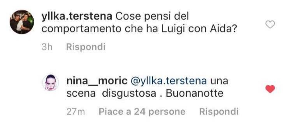 Insomma, cosa ha voluto dimostrare la Moric con questo commento? Che sia sua intenzione lasciare il suo fidanzato ora che lui si trova all’interno della Casa più spiata d’Italia? D’altronde Nina aveva già affermato di non riconoscere più Luigi ancora quando erano uscite soltanto le notizie sull’amicizia intima tra lui e Patrizia Bonetti, e nessuno ancora si era scagliato contro Aida Nizar. Che i due fattori abbiano contribuito a far cambiare idea a Nina? Questo ancora non possiamo saperlo anche se, stando ai commenti scritti, ci sono poche probabilità che la Moric voglia entrare al GF 15 per confrontarsi con Favoloso, anche perchè è il suo personale scopo quello di abbandonare il mondo del gossip.