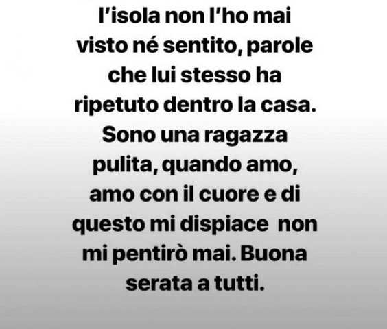 “Sono una ragazza pulita quando amo: amo con il cuore e di questo mi dispiace non mi pentirò mai. Buona serata a tutti.”