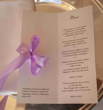 Triglia scottata in crosta di pane su guazzetto di caciocavallo podolico ha aperto la cena del compleanno di Monica Setta, piatto al quale sono seguite gocce di cime di rape e marshmallow allo zenzero e, successivamente, risotto acquarello al caviale con tartare di scampi e tartufo nero, ravioli di burrata su crema di finocchi, acciughe del cantabrico e scorzette di arance caramellate, ombrina rossa del Gargano scottata con mostarda di sesamo e infuso al miso con contorno di patate di Polignano cotte nell’acqua di mare e scottate alla cenere profumata di timo, per concludere con una composta di frutta della Peschiera.