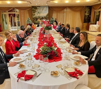 Ha scelto di aspettare il Natale organizzando una grande cena al Parco dei Principi di Roma Monica Setta, conduttrice di Unomattina in famiglia, che ieri sera ha condiviso sui social numerose foto della lunga tavola imperiale per trenta invitati, decorata con tralci di melograno rosso, candelieri d’argento e fili di perle di cristallo, ma anche rose rosse e alberi di Natale mignon. Tra i partecipanti, come vediamo nella foto in alto, il Professor Giampaolo Tortora (Direttore dell’Oncologia Medica e del Cancer Center del Gemelli), il noto commercialista Gianluca Timpone, Monica Giandotti (conduttrice di Unomattina) e Rosanna Lambertucci.