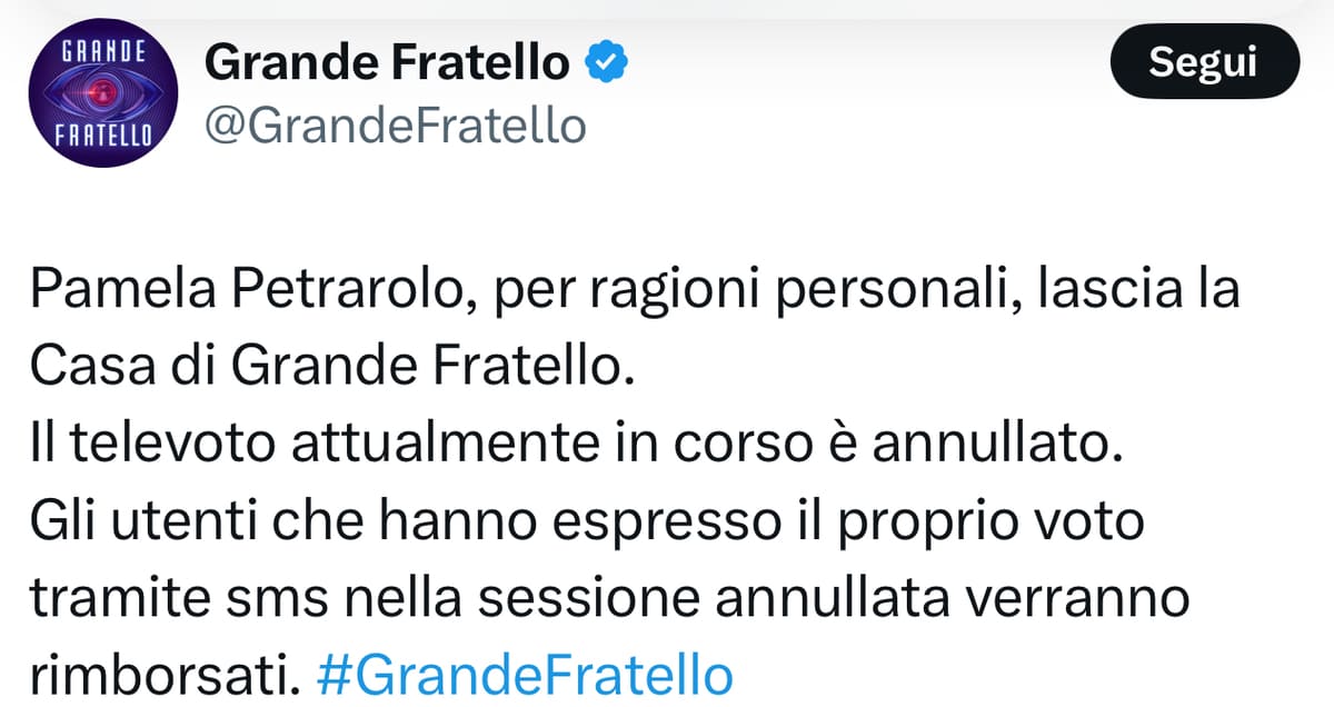 Il ritiro di Pamela Petrarolo ha portato a delle conseguenze. Difatti il televoto del reality show condotto da Alfonso Signorini è stato ufficialmente annullato e coloro che hanno speso dei soldi verranno naturalmente rimborsati: